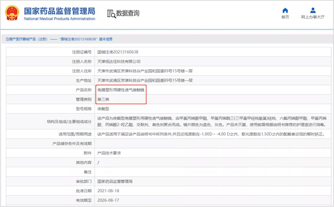 ——2021年8月18日,天津視達佳科技有限公司生產的產品“夜戴型角膜塑形用硬性透氣接觸鏡(ok鏡)”獲批國家藥監(jiān)局三類醫(yī)療器械注冊證(國械注準20213160638),這也是國產的第三張角膜塑形鏡產品證書。