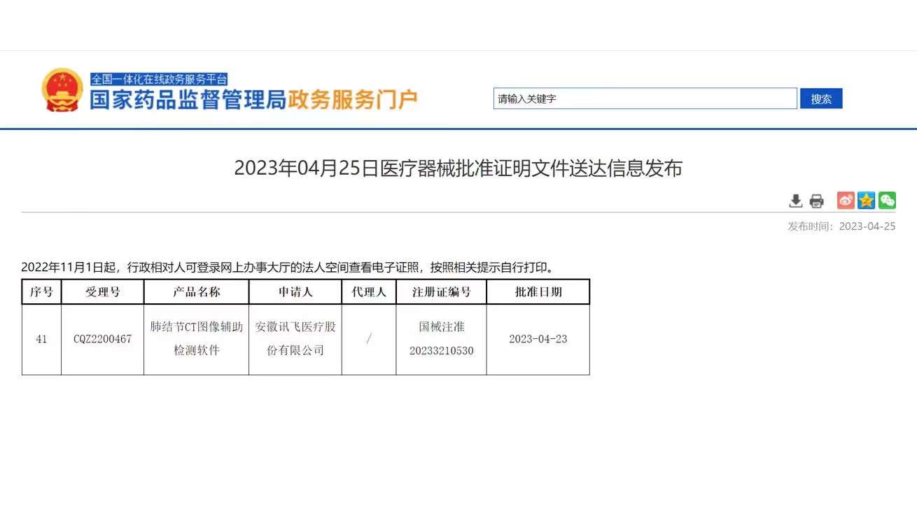 2023年4月25日,經(jīng)國家藥品監(jiān)督管理局公示,安徽訊飛醫(yī)療股份有限公司的“肺結(jié)節(jié)CT圖像輔助檢測軟件”(國械注準(zhǔn)20233210530)獲得NMPA批準(zhǔn)上市,奧泰康承擔(dān)本項(xiàng)目臨床試驗(yàn)服務(wù),系2023年奧泰康助力獲得的第7張三類醫(yī)療器械注冊證,也是公司累計(jì)助力獲得的第12張人工智能(AI)醫(yī)療器械注冊證。