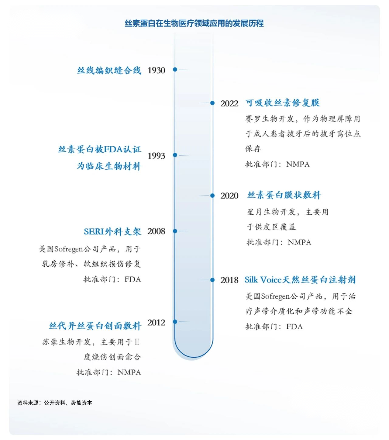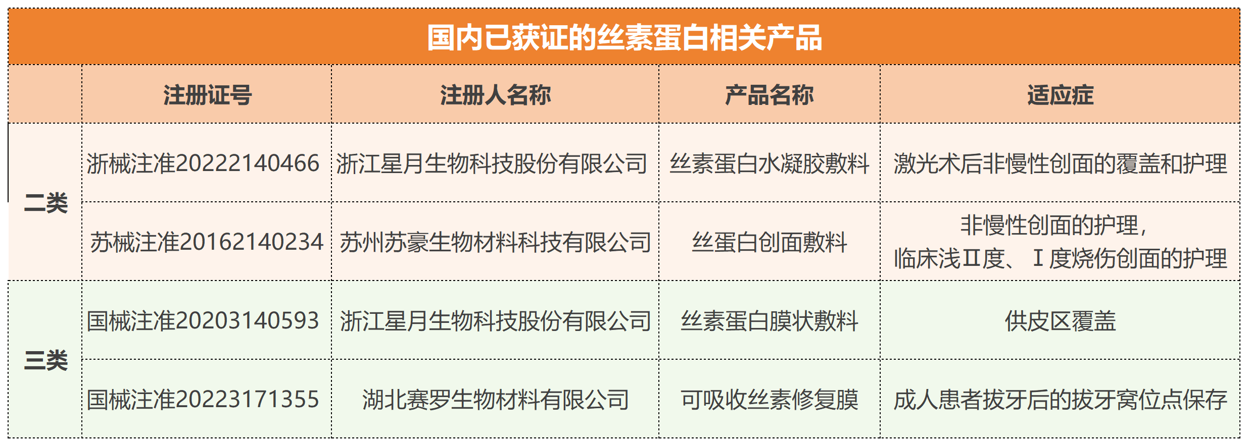市面已對(duì)絲素蛋白制備的做了廣泛探究,目前成功商業(yè)化的產(chǎn)品不多(蠶絲縫合線、SERI外科支架、絲蛋白創(chuàng)面敷料、可吸收手術(shù)修復(fù)膜、Silk Voice®注射劑等),目前國(guó)內(nèi)共四款絲素蛋白產(chǎn)品獲批,其中僅一款為可吸收產(chǎn)品,說明市場(chǎng)仍具有巨大發(fā)展?jié)摿Α?/em>