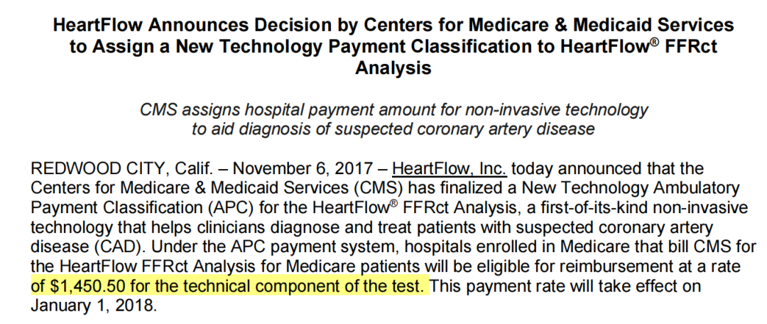 美國(guó)HeartFlow公司的FFRCT從2014年開(kāi)始在歐美日韓等發(fā)達(dá)國(guó)家進(jìn)行了廣泛應(yīng)用,被寫(xiě)入多個(gè)臨床指南,且多個(gè)保險(xiǎn)產(chǎn)品都可報(bào)銷相關(guān)的檢查費(fèi)用,從2018年1月1日起,美國(guó)醫(yī)保報(bào)銷金額為1450.5美元/例(圖3)。