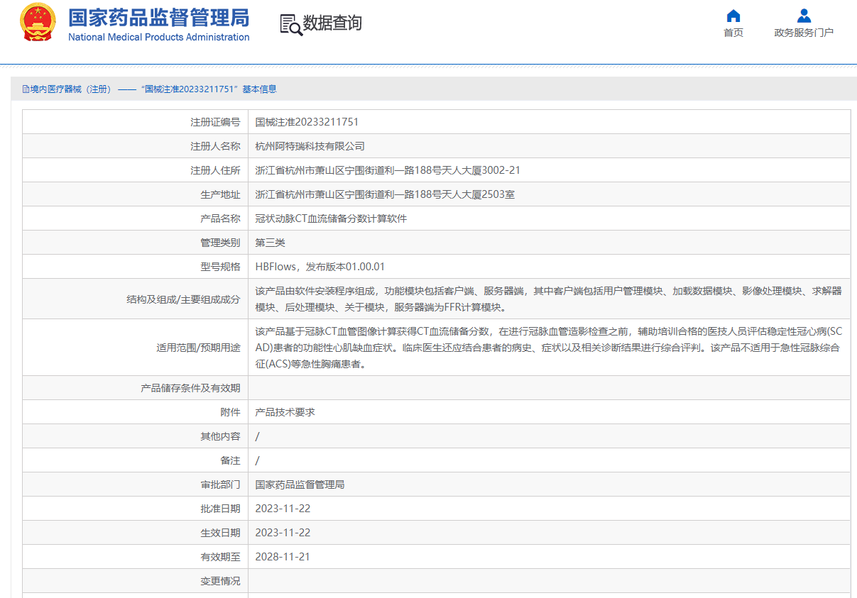 近日,國(guó)家藥監(jiān)局網(wǎng)站公開(kāi)發(fā)布了最新一批三類醫(yī)療器械批準(zhǔn)清單,杭州阿特瑞科技有限公司研發(fā)的《冠狀動(dòng)脈CT血流儲(chǔ)備分?jǐn)?shù)計(jì)算軟件》(簡(jiǎn)稱FFRCT)已經(jīng)獲批上市(圖1),該軟件核心算法完全自主研發(fā),不受制于人。該產(chǎn)品由中美團(tuán)隊(duì)聯(lián)合研發(fā),雙院士團(tuán)隊(duì)臨床驗(yàn)證,是目前國(guó)內(nèi)唯一采用全三維流體力學(xué)方程+超級(jí)計(jì)算機(jī)計(jì)算且被商業(yè)保險(xiǎn)公司認(rèn)可的產(chǎn)品,也是目前被國(guó)家藥監(jiān)局認(rèn)可不需要在“灰區(qū)”(介于0.75至0.85)冠脈彌漫性病變進(jìn)一步研究的無(wú)創(chuàng)醫(yī)療產(chǎn)品