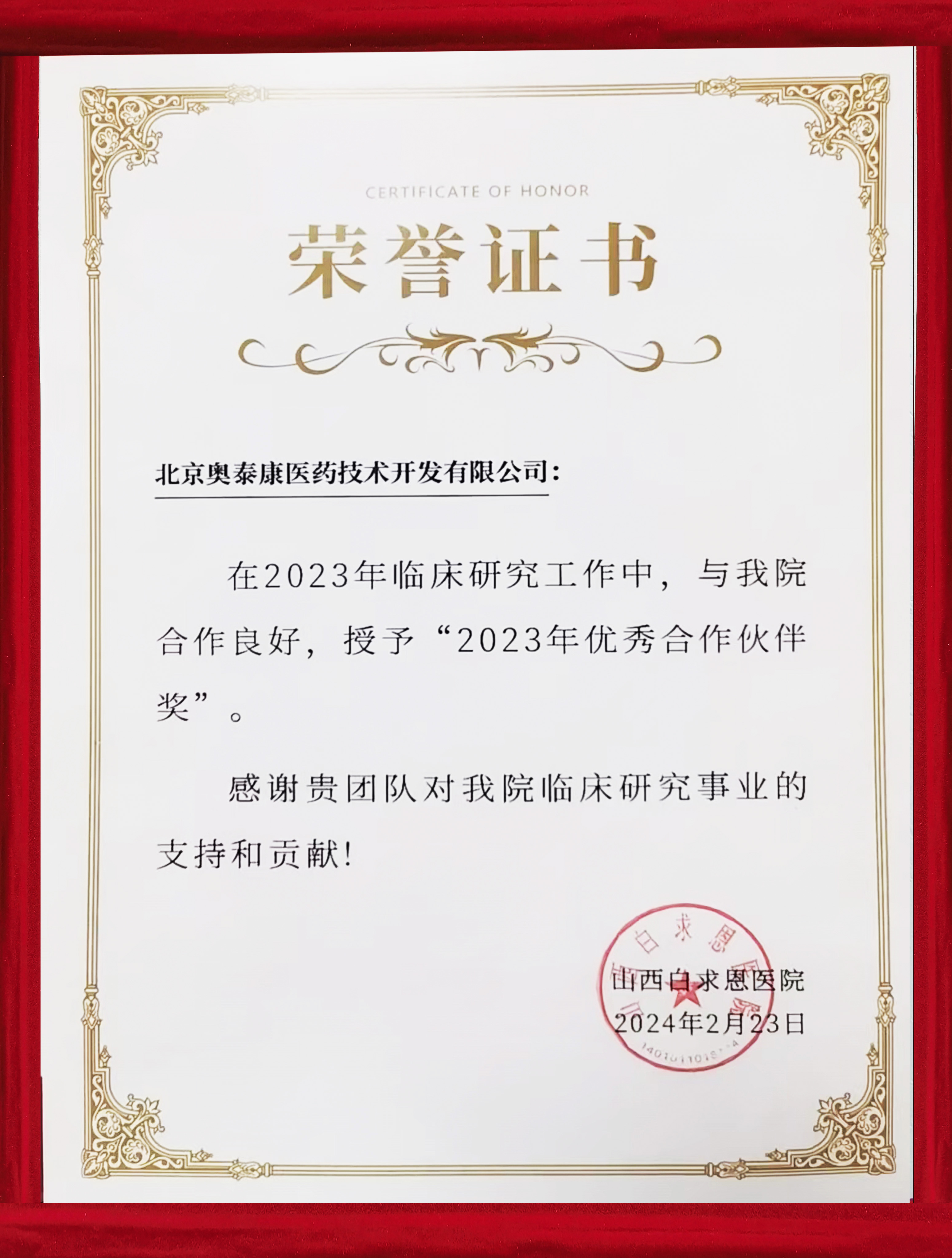 喜報~奧泰康榮獲山西白求恩醫(yī)院 同濟山西醫(yī)院“2023年優(yōu)秀合作伙伴獎”攜手前行,推進臨床研究事業(yè)高質(zhì)量發(fā)展???