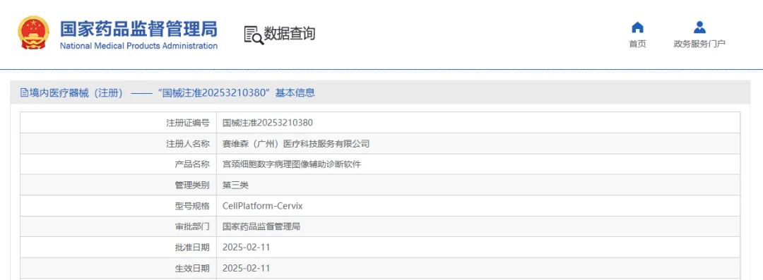 賽維森科技自主研發(fā)的“宮頸細胞數字病理圖像輔助診斷軟件”,正式獲得國家藥監(jiān)局(NMPA)頒發(fā)的第三類醫(yī)療器械注冊證,是宮頸細胞學領域首張“輔助診斷”三類證。人工智能正式升級為醫(yī)生的“超級助手”?。ㄗ宰C編號:國械注準20253210380)
