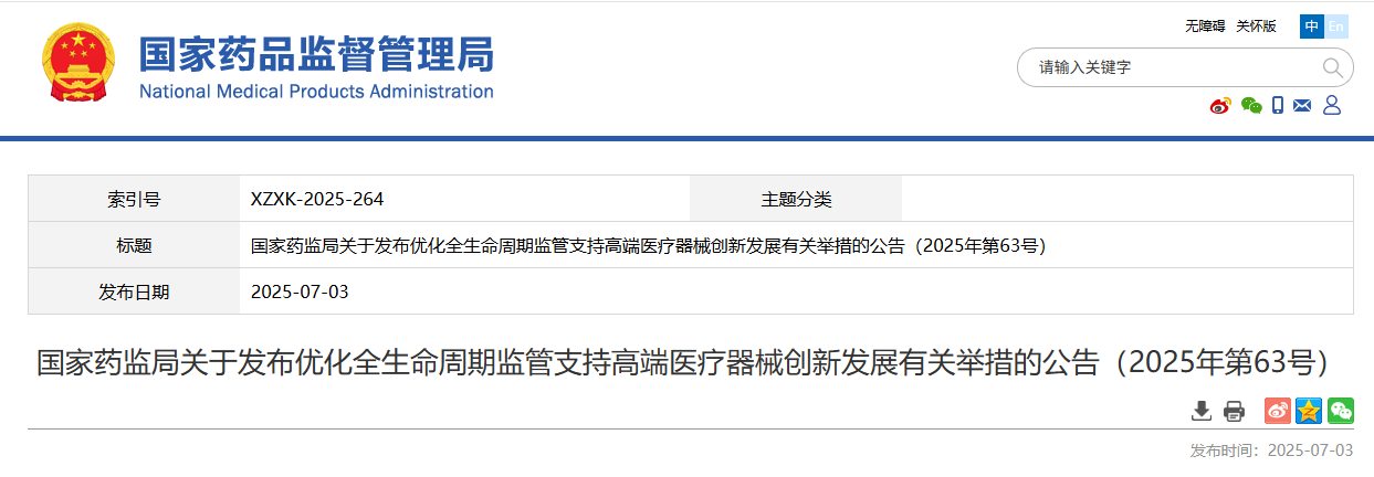 國家藥監(jiān)局關于發(fā)布優(yōu)化全生命周期監(jiān)管支持「高端醫(yī)療器械」創(chuàng)新發(fā)展有關舉措的公告(2025年第63號)