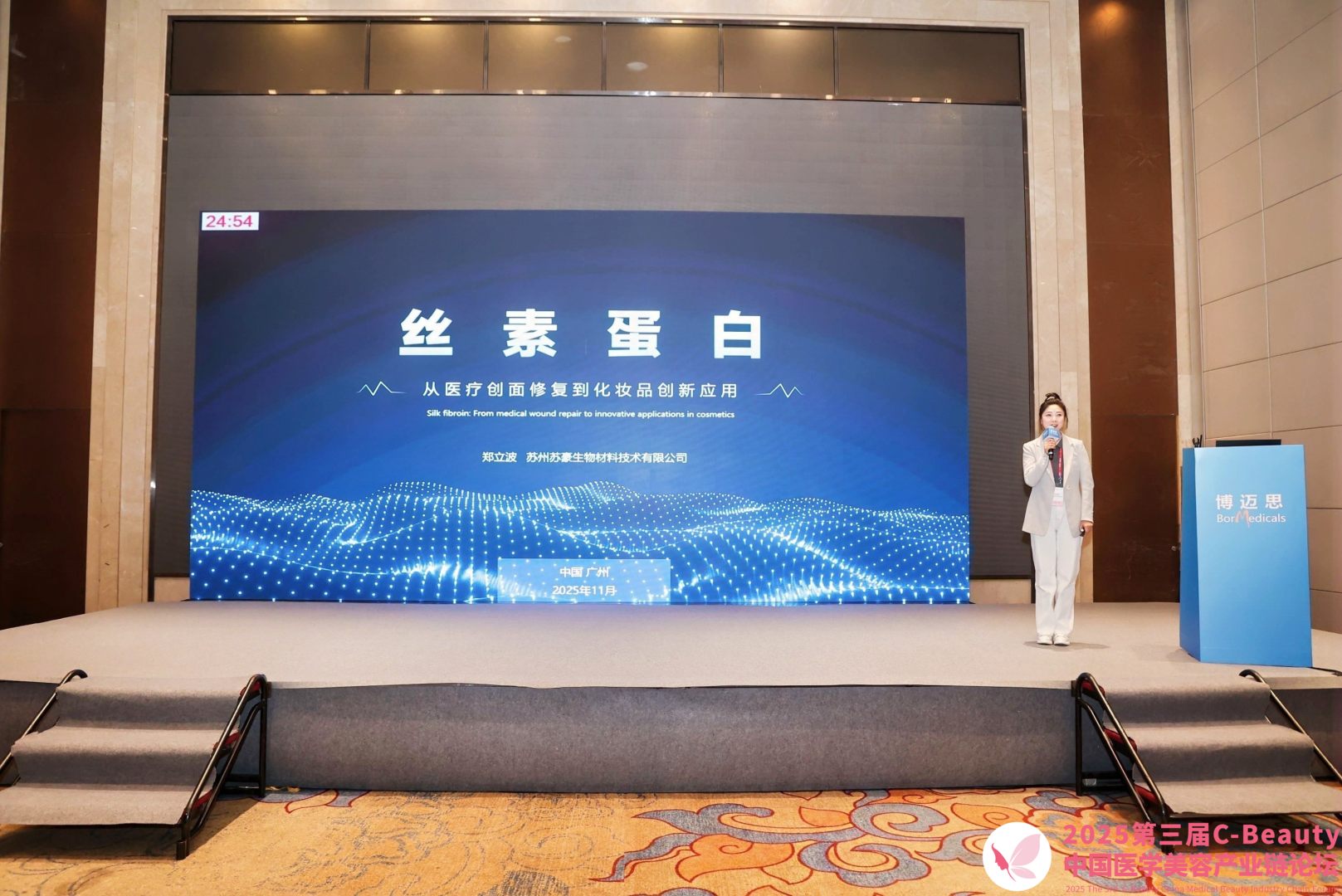 21日上午,蘇豪生物化妝品事業(yè)部總經(jīng)理鄭立波女士受邀出席“醫(yī)美智造與工藝創(chuàng)新”分論壇并作主題演講《絲素蛋白:從醫(yī)療創(chuàng)面修復(fù)到化妝品創(chuàng)新應(yīng)用》。